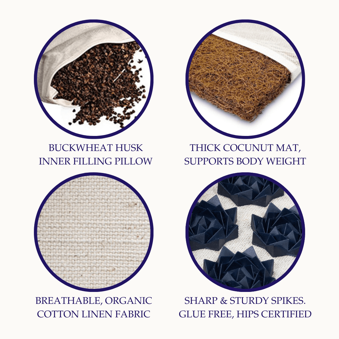 The mat and pillow work by stimulating the acupressure points to increase circulation, reduce muscle tension, and release endorphins that promote relaxation and healing.